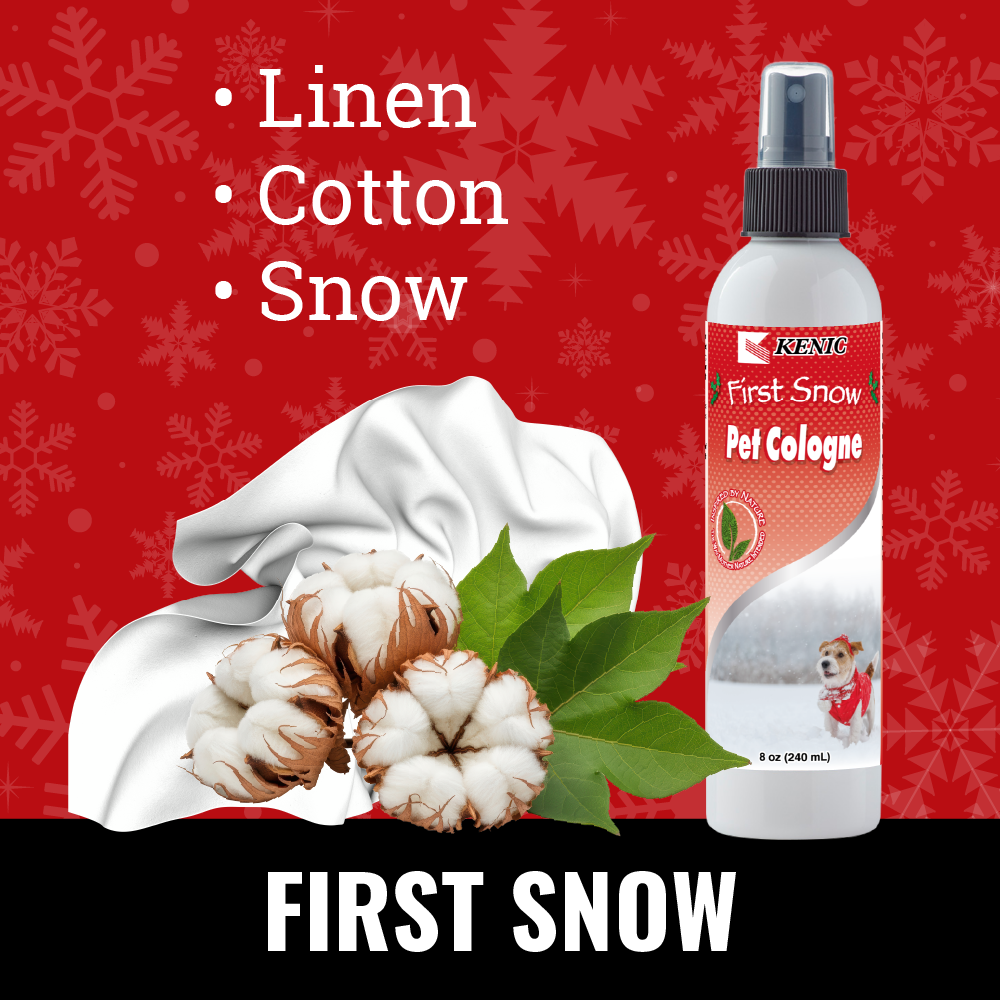 First Snow Pet Cologne captures the invigorating essence of freshly fallen snow with a crisp, cotton-linen fragrance; it's delicately uplifting. Formulated with premium coat conditioners, this gentle spray helps neutralize odors while leaving your pet’s coat soft, refreshed, and smooth. The scent is light yet lasting, creating an atmosphere of purity and calm without overpowering.